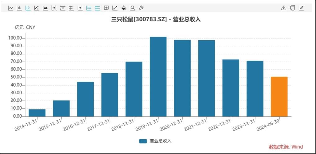 从 2019 年上市后披露的首份年报来看,三只松鼠当年来自于第三方电商平台的营收为 98.69 亿元,占公司总营业收入的 97%;当年,公司总营收首次、也是唯一一次突破百亿大关,此后便持续下滑。