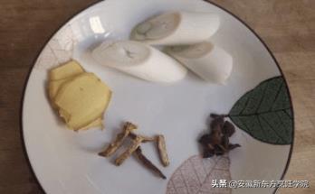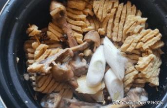 4、锅内放入鸡架、豆腐串、葱、姜、八角、陈皮、料酒、盐、胡椒粉,加入适量水。
