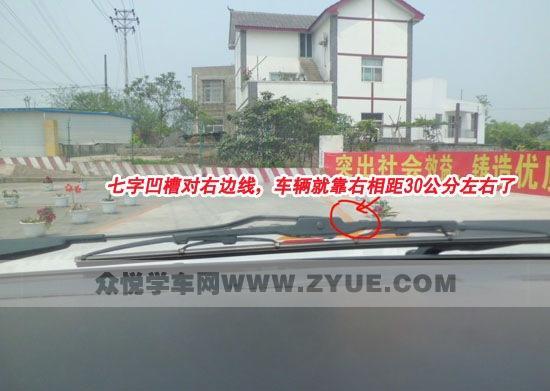 车辆尽量靠右行驶,车上观察,雨刮器七字凹槽对右边线时,车辆正好靠右大概30公分左右