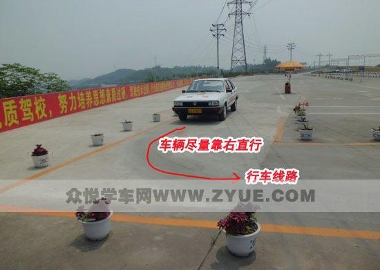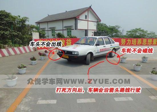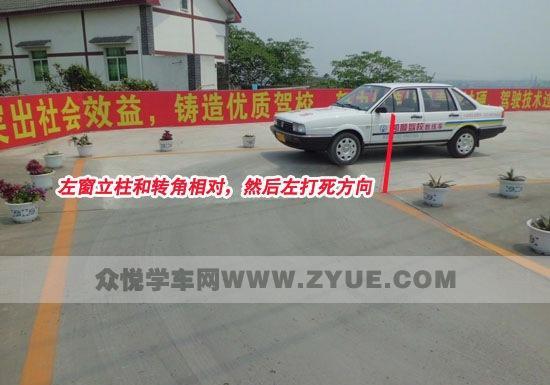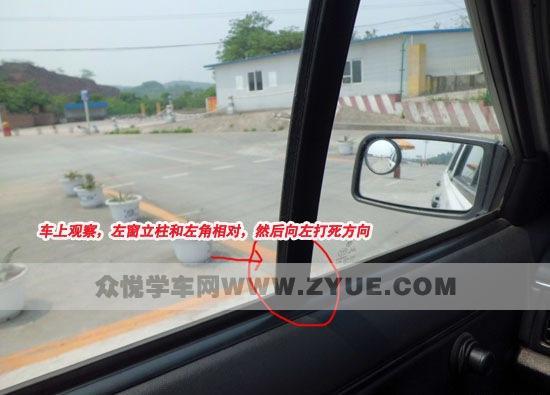 行驶至左窗立柱和左角相对时,保持车速,然后向左打死方向(速度慢、方向快)