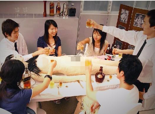 这里,我要向大家介绍的是食人宴,日本人的新招数,将餐桌布置成手术台的样子,一个由食物组成的人体模型,在躯干上下刀,会有仿真的血液流出,切开身体,其“内脏”是可以吃的东西,但视觉效果是血淋淋的。