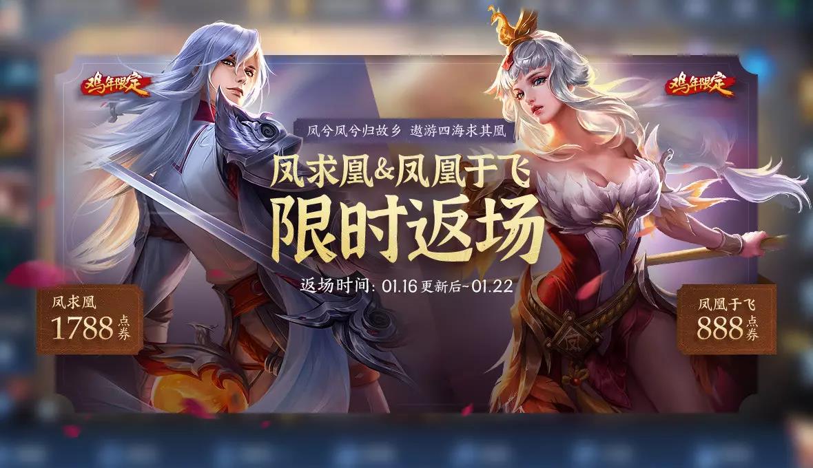 返场的日期将会是1月16日更新后至1月22日23:59。也就是差不多刚好一周的时间。过了这一周,凤求凰与凤凰与飞以后就可能只有“欧皇”玩家才有机会获取了。