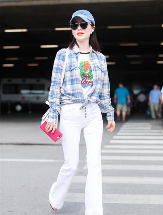 当天的舒畅戴着一顶牛仔元素的棒球帽,穿上了一件格子衬衫,还在前面绑了一个结,还别说,这样穿的舒畅还蛮酷的呢,裤子是一条紧身的白色裤子,整体搭配是比较清新的。