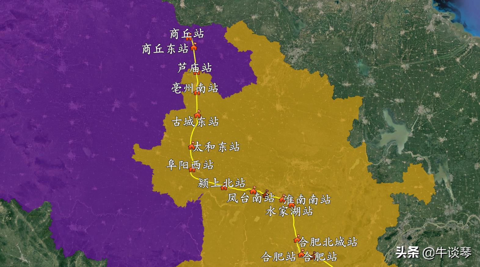 今天给伙伴们带来的是商合杭高速铁路线路图: