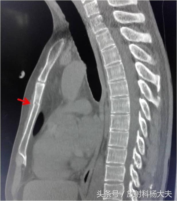 先看看病人的CT吧,箭头所示是胸骨,骨质断裂了,没错,是胸骨骨折。