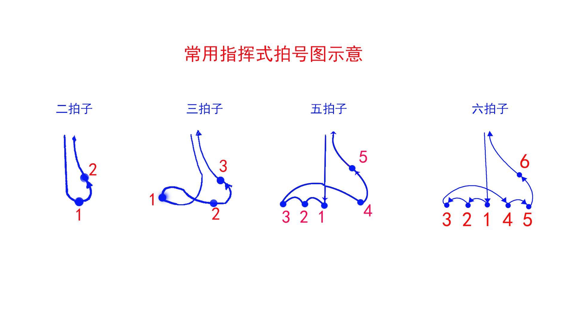 下面有二拍子、三拍子、五拍子、六拍子。加上前面说的四拍子,共五种指挥手势。这些都是一些常用的指挥手势图。