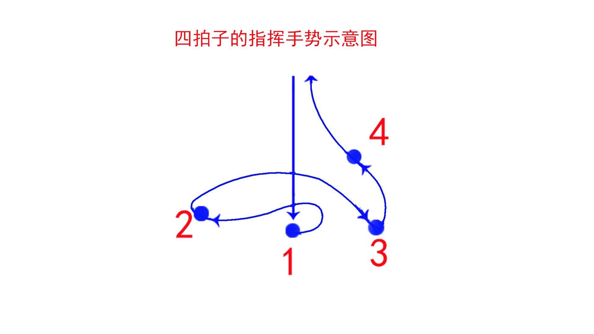 一、四拍子的指挥手势动作是:1向下、2往左、3向右、4回上。