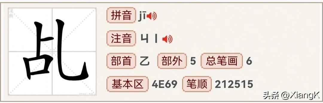 读音:“jī”、同音字:机、部首为乙、总笔画6、左右结构。