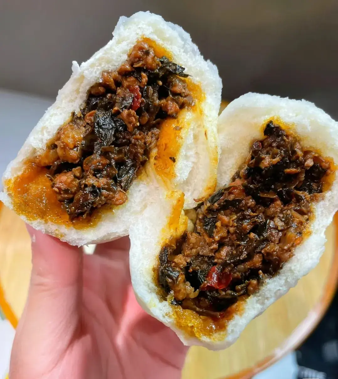 详细做法:梅干菜泡发洗净攥干水分。猪油小火下锅融化,下葱姜末炒香,放入肉馅炒至变色,加入生抽、老抽、料酒、蚝油、胡椒粉翻炒均匀,再加入梅干菜、盐、糖、鸡精调味即可出锅。