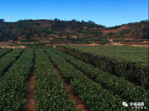 蜿蜒的盘山公路边,种植着特色茶叶,一排排整齐的茶树,一层层排列成梯形的茶山,蔚蓝的天空,碧绿的茶叶,褐黄的土地,典型的南方丘陵风光。