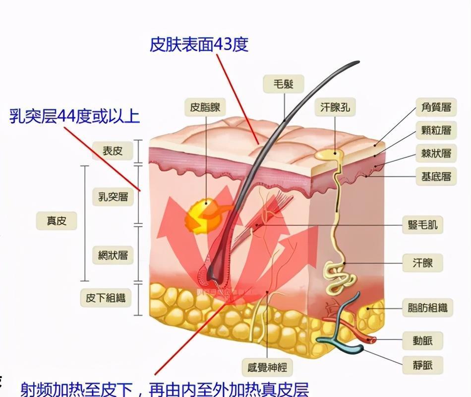 只有透过射频作用于真皮层,使真皮层加热到44度或以上,或加热到皮肤表面达43度,并且加热足够的时间,才能达到我们所说的美容效果,既能作用到真皮层的胶原蛋白,又不会烫伤表皮。