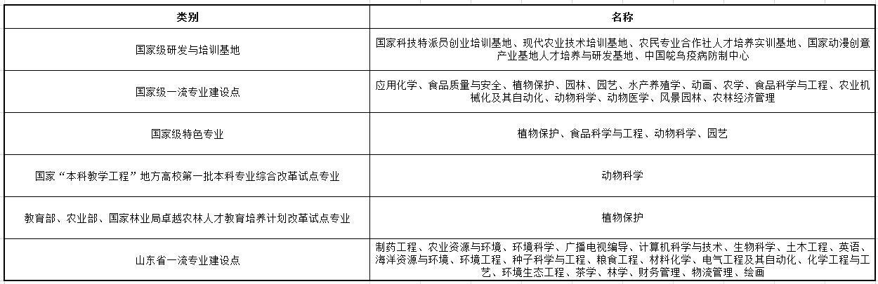在教学建设方面,截至2022年10月学校获批14个国家级一流专业建设点、21个省级一流专业建设点,有国家级特色专业4个,国家“本科教学工程”地方高校第一批本科专业综合改革试点专业1个,教育部、农业部、国家林业局卓越农林人才教育培养计划改革试点专业1个,山东省高水平应用型立项建设专业(群)7个,山东省卓越工程师教育培养计划项目3个,省属普通本科高校应用型人才培养专业发展支持计划试点专业2个,省级特色专业13个,省级品牌专业1个,山东省教育服务新旧动能转换专业对接产业项目2个。