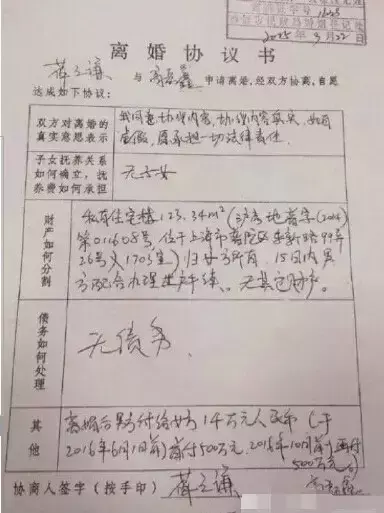 2015年的时候,薛之谦与高磊鑫在9月22日签署离婚协议,有媒体曝光薛之谦给了女方1000万连带着两个人在普陀区的房子。再就是前段时间薛之谦在演唱会唱歌示爱前妻,进而在9月8号两个人微博宣告复合。
