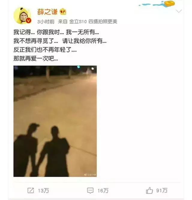 为什么观点菌稍微倾向于这种说法呢,这反映了薛之谦对待感情的一个态度。我们来重新看一下两个人复合的微博,薛之谦说:“我记得你跟我时,我一无所有,请让我给你所有....”高磊鑫说:“那么,余生请对我好一点”。