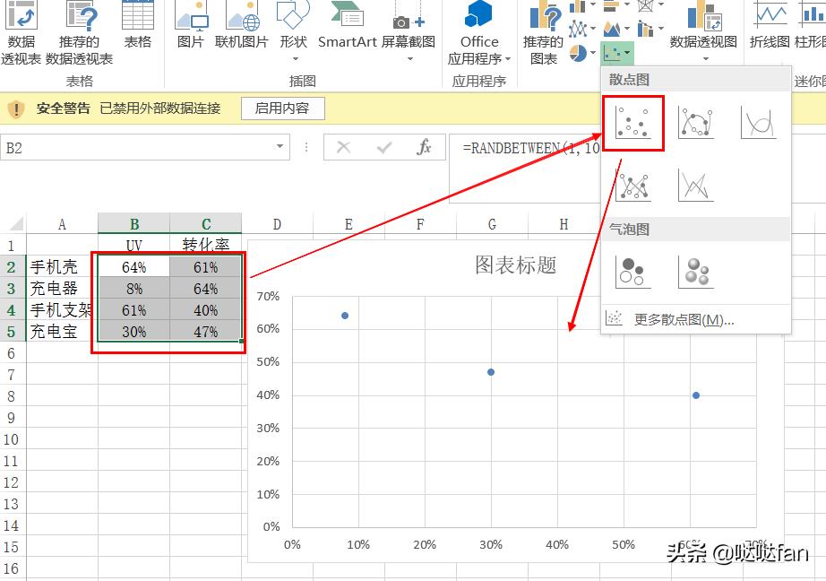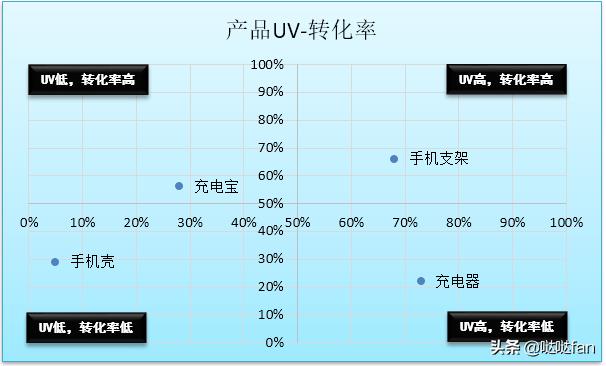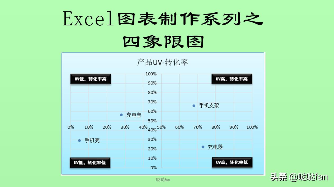 当一个元素仅对应两个变量,且两个变量之间存在着相关性,此时,用柱形图的话可读性不强烈,可以考虑用四象限图展示数据,其特点是可读性强,对应关系一目了然,但不足之处在于数据元素不宜太多,否则可读性就弱了。那么,如何制作四象限图?其本质为散点图,具体操作如下: