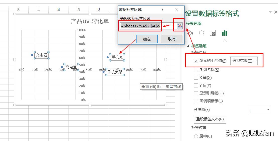 4.添加标签:选择‘添加数据标签’,右击选择‘设置数据标签格式’,选择“单元格中的值”,选择表示名称的列,如下图: