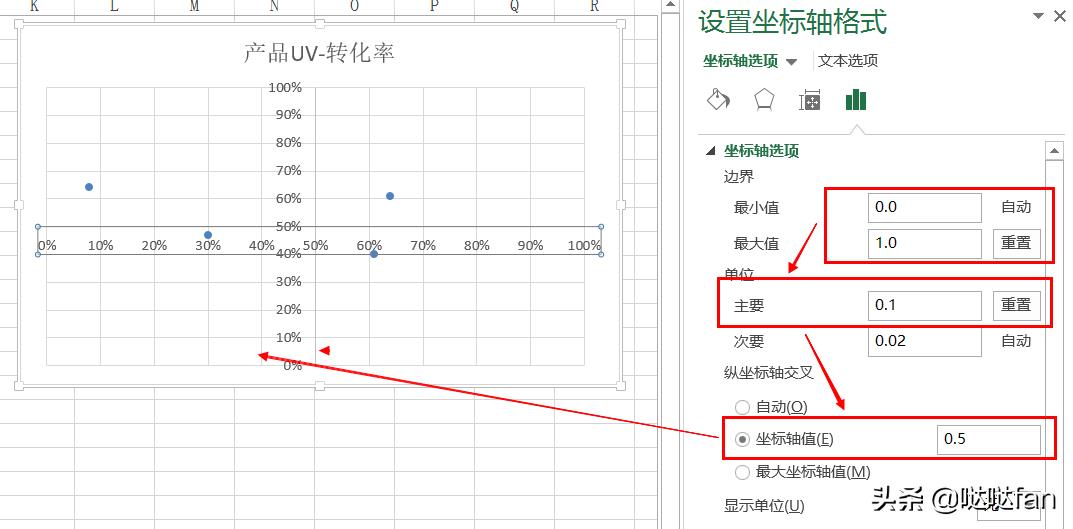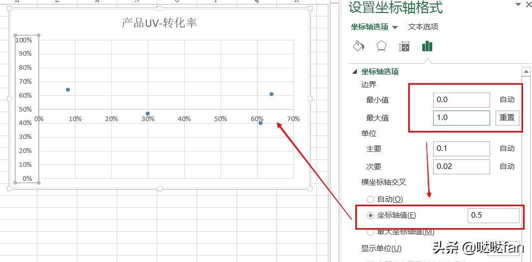 3.修改Y坐标轴位置:右击X坐标轴,选择‘设置坐标轴格式’,修改坐标轴‘边界’为(0,1),此处多一步骤,修改‘单位’中‘主要’栏的为‘0.1’,因为当修改边界时,默认间距为‘0.2’,‘坐标轴值’改为‘0.5’,则Y坐标轴移动到X坐标轴的中间位置,如下图: