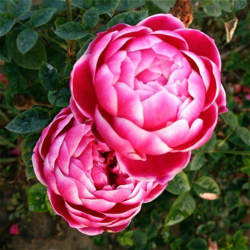玛丽玫瑰色最像牡丹的一种玫瑰了,它的花朵大而丰满,花瓣的边缘代有白色,花瓣为玫红色。玛丽玫瑰的花朵呈现包子状,不容易打开。花朵盛开的时候,花瓣也呈现出包裹的状态。造型中月季中别具一格,别有一种雍容的美感。