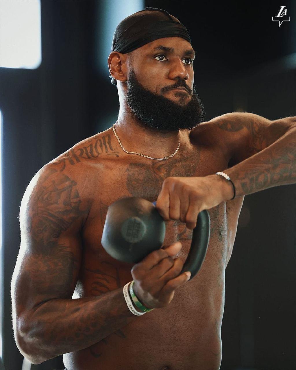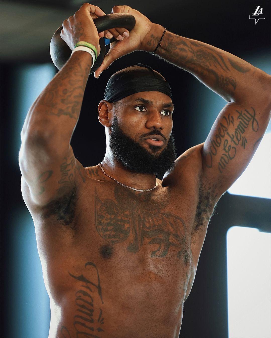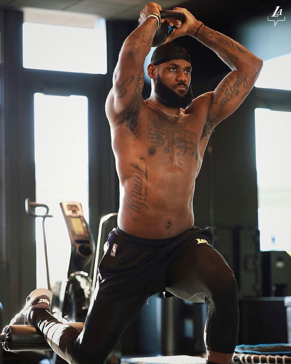 照片中,詹姆斯赤裸上身训练,眼神坚毅、一身肌肉线条格外抓人眼球。