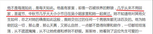 他虽有家室,却是一匹被放养的野狼,几乎从来不用回家,圣诞节、中秋节几乎大大小小的节日在吴小姐家里和她一起度过......