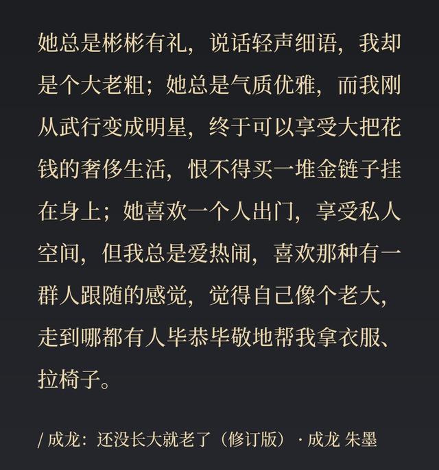 反而出身贫寒的林凤娇,更能和成龙的兄弟们打成一片,大家都喜欢她,可以跟她一起吃大排档,一起拼酒。