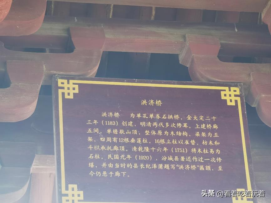 城南有一座洪济桥,初建于金代大定年间,乾隆年间修缮时,将木柱换成了石柱,就是我们现在看到的,据说桥上建廊在国内已属罕见,并且以石为柱,尤为稀罕,有桥梁专家称“洪济桥”是桥梁建筑中的精品。