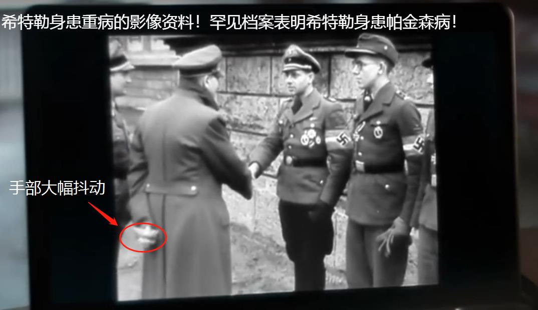 视频中他正与纳粹年轻士兵握手交流,但我们发现他背在身后的左手开始不受控制的大幅度的抖动,甚至走路也不顺畅,基本是拖行的状态,而且希特勒生前的医生莫雷尔也有相关的记录,他最早发现希特勒身体出现状况是在1941年,直到战争结束的前夕,他才确定希特勒患有震颤症,也就是我们俗称的帕金森综合征,而确诊的时候,希特勒的症状已经十分严重了。