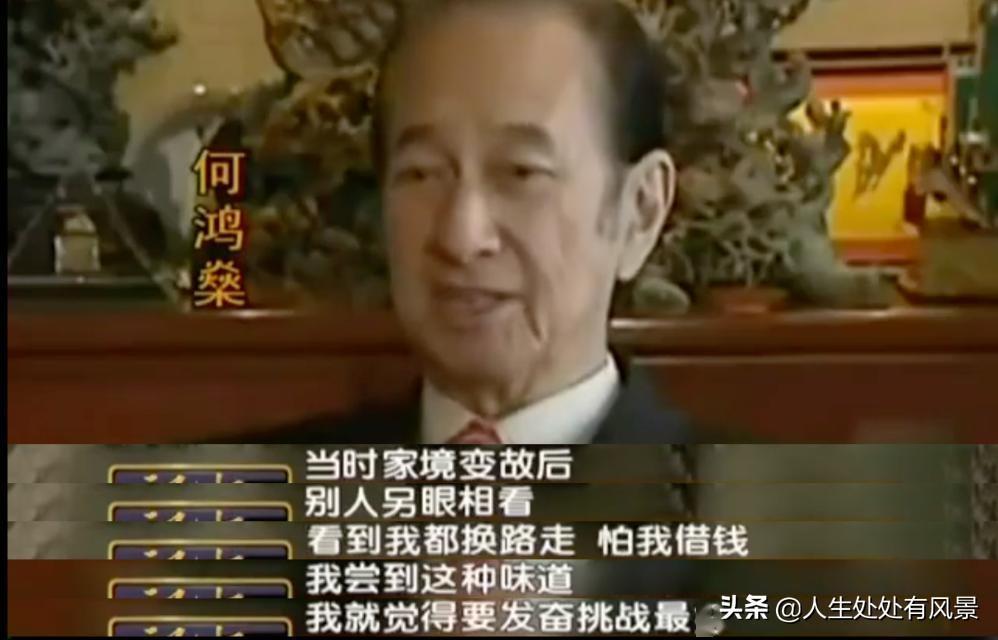《赌城大亨》电影的开头也提到了这段经历何鸿燊回忆起当时的情境曾说:“好惨啊,我从很富裕的家庭变到那么穷,连亲戚见到我们都绕路走,一向当我是宝的,忽然都当我是咸水草。”家道中落后,牙疼的何鸿燊找当牙医的表姑父补牙,得知他身上没钱,以前和颜悦色的表姑父当即翻脸:“要补牙就拿钱来,既然没钱补,干脆拔掉算了。”