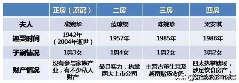 何鸿燊一共娶了四房太太,不断开枝散叶,在57个年头里孕育了17个子女,号称“四房十七杰”。四位太太各自为政,一个庞大而复杂的家族就此建立。