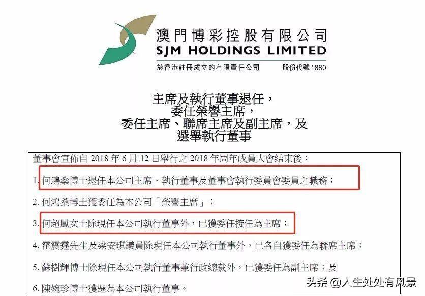 2017年6月23日,信德集团发布公告,何鸿燊退任信德集团有限公司董事会主席,改由何超琼接任。2018年6月12日,澳门博彩控股有限公司发布公告,何鸿燊退任公司主席、执行董事及董事会执行委员会委员职务,何超凤除现任执行董事外,正式“接棒”主席一职。
