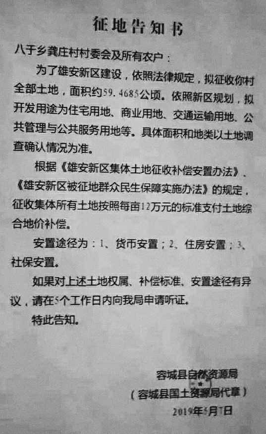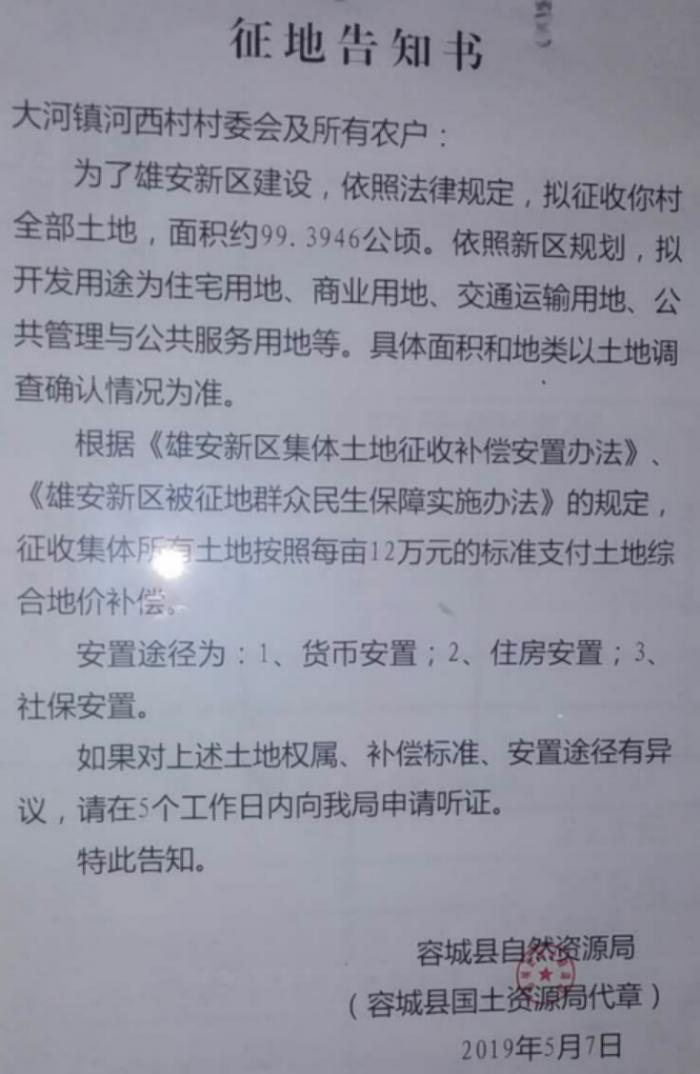 当天,根据河北雄安新区管理委员会关于启动容城县第一批城市建设用地土地转用征收工作的通知,并经容城县人民政府批准,容城县自然资源局分别在大河镇河西村、八于乡龚庄村村务公开栏张贴征地告知书。