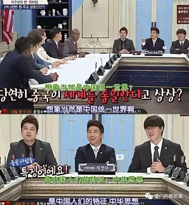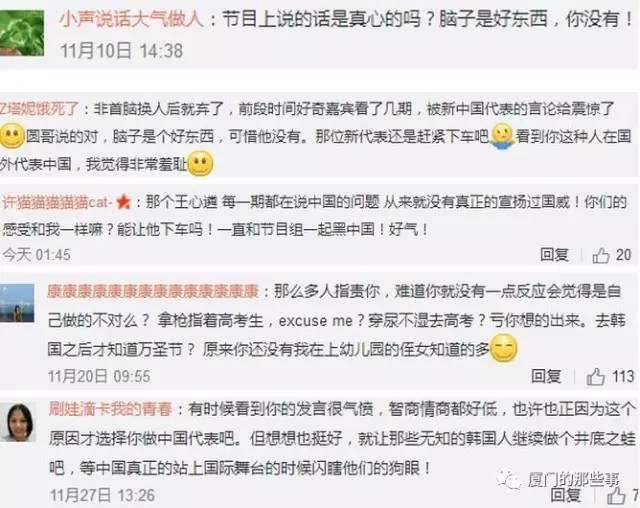 微博博主“八哥专用”发布了一组韩国综艺节目截图,配文称:“最近韩国节目《非首脑会谈》的中国嘉宾王心遴简直有毒,口无遮拦,频频黑中国。说中国高考时特工队会拿枪监视,考前要进卫生间做一次全身检查,所以大家会穿纸尿裤去考试。提到南京大屠杀时,他说中国学习世界史百分之八十都是关于日本的。