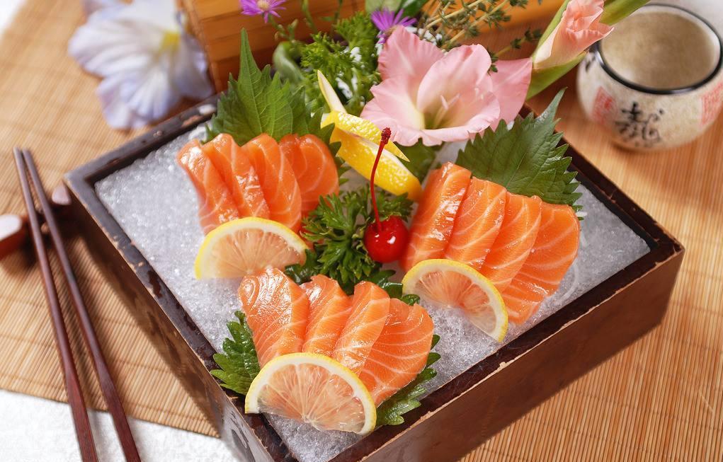 三文鱼刺身色彩鲜艳,让人看到就食欲大增。食用时搭配芥末、酱油,鲜嫩爽口,开窍通气。三文鱼具有很高的营养价值,能有效降低血脂和胆固醇,增强脑功能,防治心血管疾病和老年痴呆,享有“水中珍品”的美誉。
