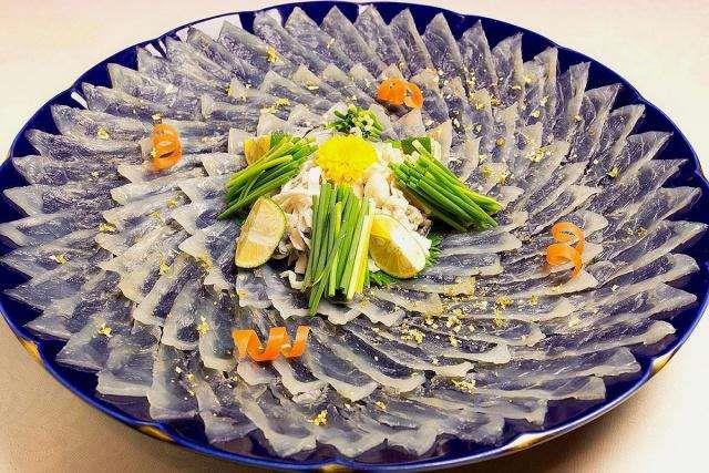 河豚是一种美味与危险并存的食材。在食用前要严格将鱼肉和有毒的内脏分开,只有拥有相关资格证书的厨师才可以料理河豚。将其切成薄如蝉翼的片状,精心摆盘,可谓一道上等的刺身料理。
