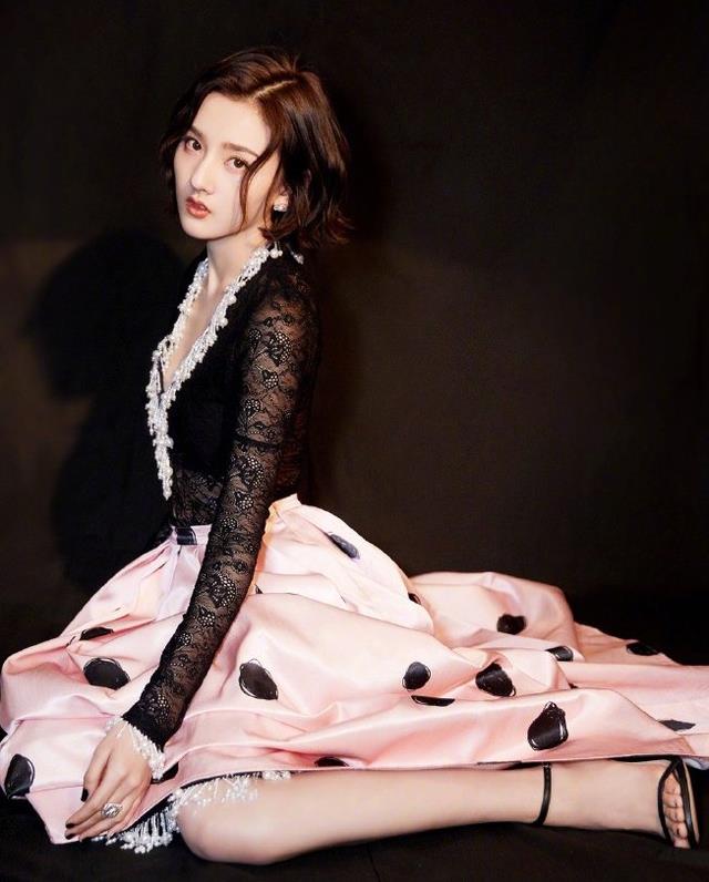 黑色蕾丝珍珠V领上衣+粉色波点半身裙+黑色细高跟,偏成熟的穿搭,温暖的颜色搭配V领黑色蕾丝,展现了极尽的妩媚和性感。粉色波点裙在性感的同时为整体增加了俏皮感,中长的卷发,姣好的腰部线条,搭配黑色细高跟,让人印象深刻。