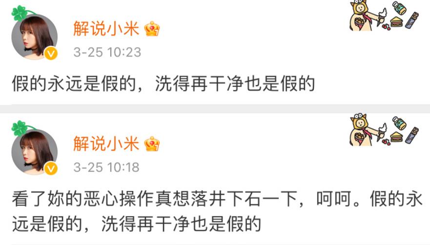 然而就在这时,LPL的一位元老级女解说小米,却是突然在微博上发言:“看了你的恶心操作真想落井下石一下,呵呵,假的永远是假的,洗得再干净也是假的。”而最近圈子里发生的这么多事情,其实想想也只有糖小幽对得上了。