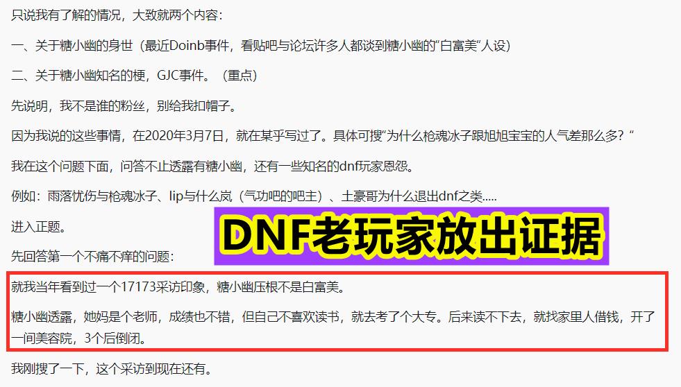 因为糖小幽早年就是玩DNF的,而在那个年代玩DNF的女玩家少之又少,每一个都是国宝级别,而糖小幽当时也是有一些人气。而这位玩家就记得,当初糖小幽接受过一个采访,采访中的糖小幽透露了她自己的家庭情况,其实条件虽说不差,但她也绝对算不上白富美,并且当初找家人借钱开美容院,才三个月就倒闭了。