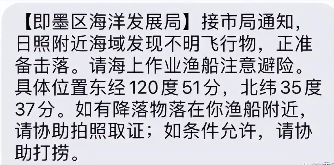 据《环球网》报道,山东省青岛市海洋发展局日前侦测到一架不明飞行物现身于山东省日照市海空域。青岛市有关部门对此迅速下发通知,提醒周边正在作业的渔船必须注意安全,目前官方正考虑动用武器将这一不明飞行物击落,如果这一不明飞行物的碎片散落在周边海域,也希望附近渔民拍照取证,在确保自身安全的前提下,配合官方的捕捞不明飞行物的碎片。