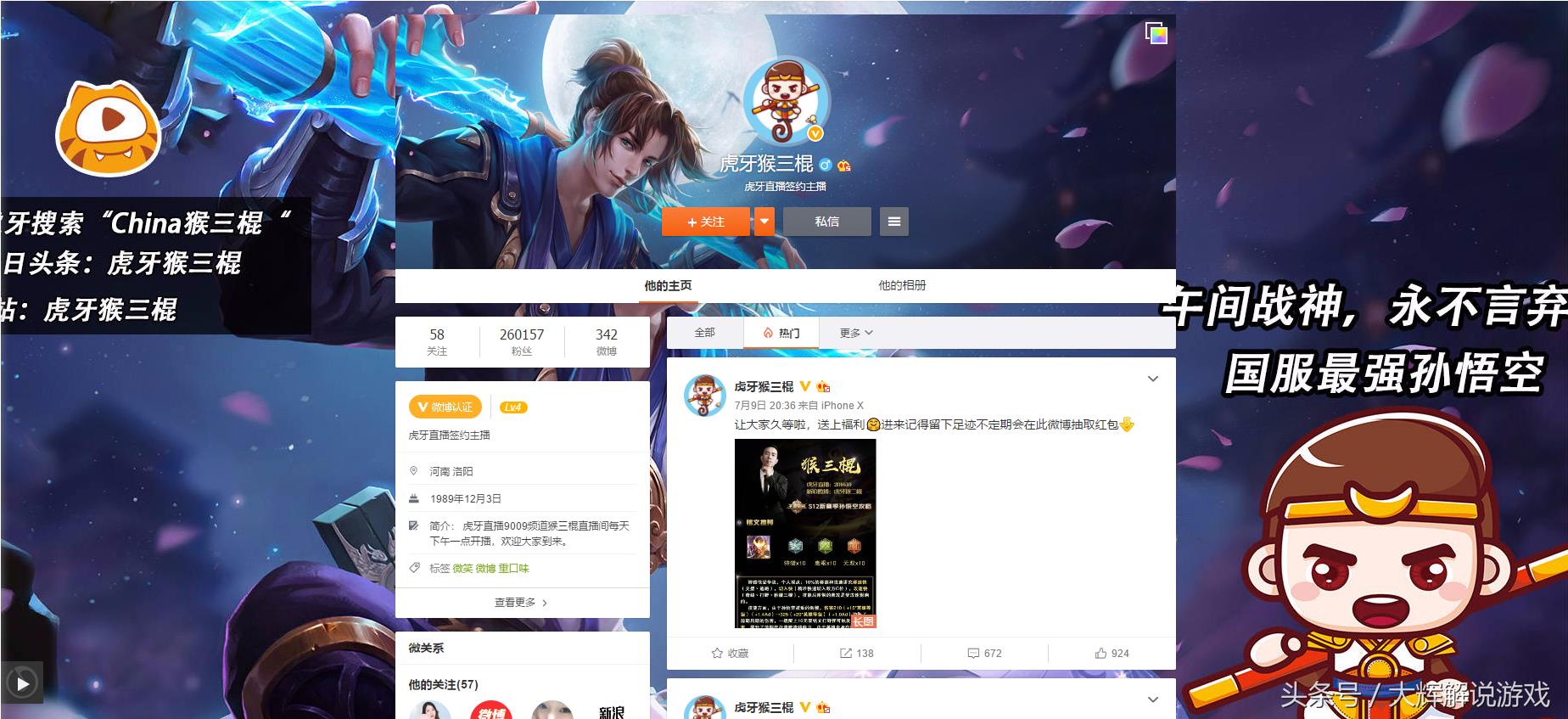 虎牙猴三棍在王者板块很有名,毕竟无人不知猴三棍的猴子有多厉害吧!猴三棍在虎牙王者板块还是很有名的,作为老主播他因为直播风格轻松愉快,并且一般玩游戏的时候心态蛮好,不会乱发脾气,当然更加不会说脏话,获得很多网友的喜爱。在直播界算是比较帅气且又沉稳的一位了,从2016年年底到现在,他的直播间订阅数早就突破200万了。