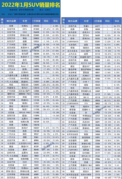 官宣:1月SUV销量排名完整版揭晓,1-400名,博越第5,途观L仅15