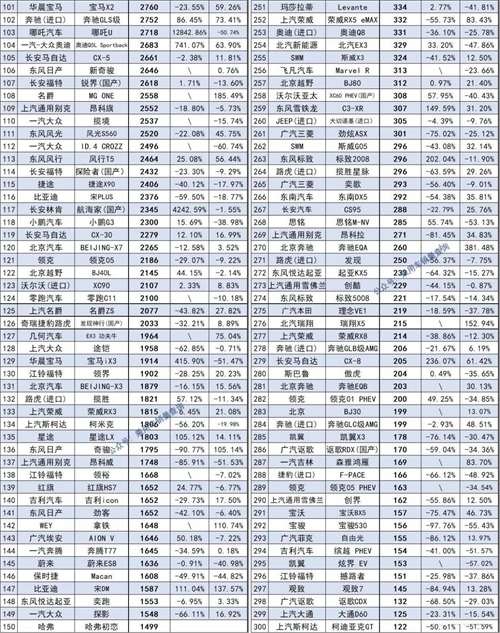 最后来看下排名201-400的SUV车型,其1月份销量不足千辆,斯巴鲁森林人、大众途锐、指南者、雪铁龙天逸、雪佛兰开拓者、北京现代ix25、东南DX7以及帝豪GS等车型,都出现了同比大跌,而思皓E20X、自由侠、瑞风S4、雷克萨斯GX、汉腾X5以及威马EX6等车型,1月份销量更是不足50辆。