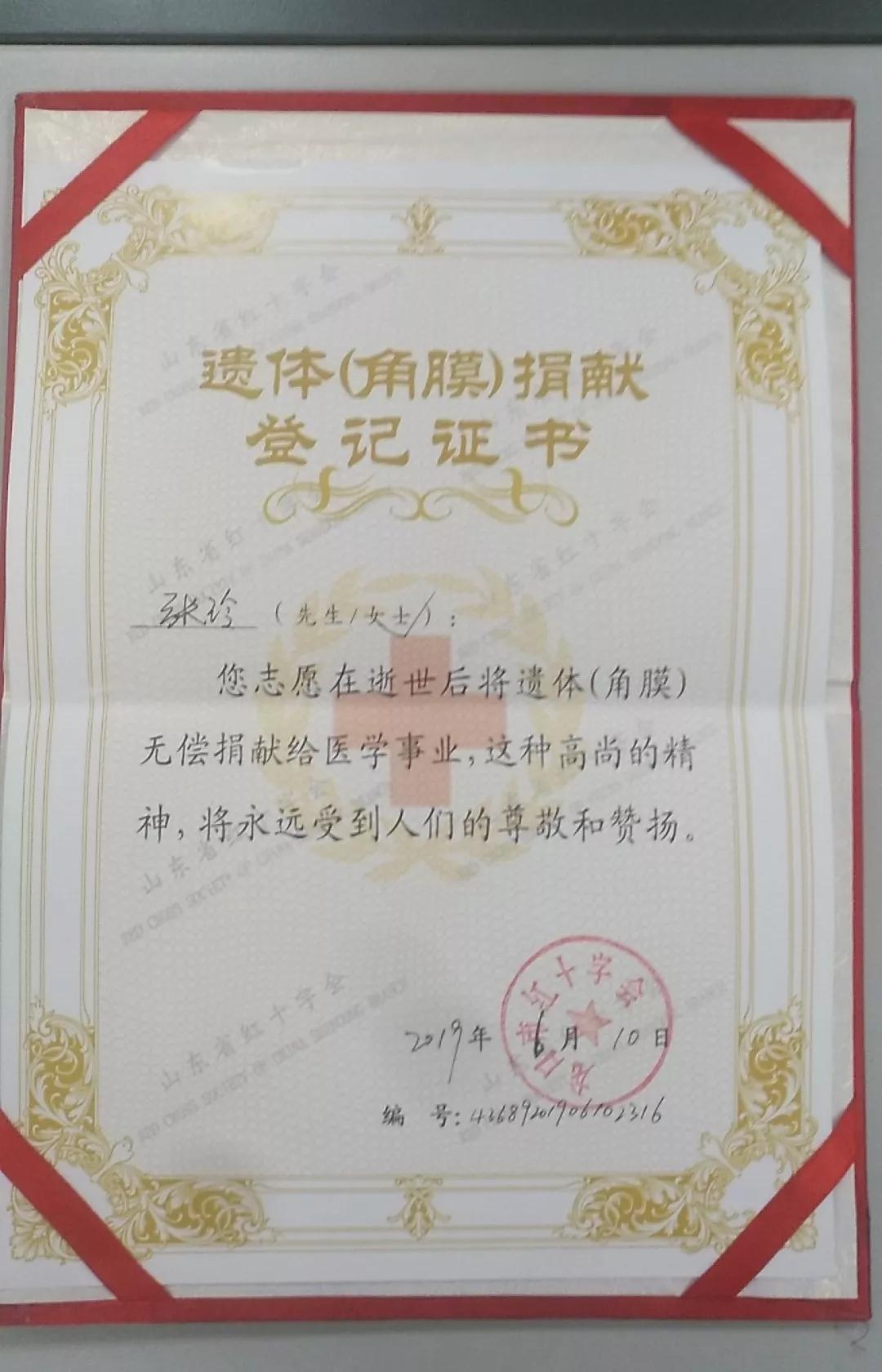 角膜捐献,临终前叮嘱信守承诺 说起女儿的愿望,白发染鬓的刘智敏泪流不止,“女儿是我身上掉下的肉,我尊重她的意愿。” 张玲的父亲张建国含泪回忆:“刚知道女儿的想法时,我的第一反应是不同意,想不开,毕竟是自己的亲生骨肉。但闺女说为别人创造光明,带来希望,是好事,讲得我没话说,我自愧不如。” 张建国又征求张玲爷爷的意见,“没想到父亲99岁高龄了还很开明,说这是好事儿,玲玲做得对,我支持。”张玲的爷爷1946年参军,参加过解放战争中的两大战役,荣立三等功,后又参加抗美援朝战争,上世纪60年代转业回龙口。 更让人感动的是,临终前张玲反复嘱咐母亲:“咱们答应的事儿,一定不能反悔呀。”