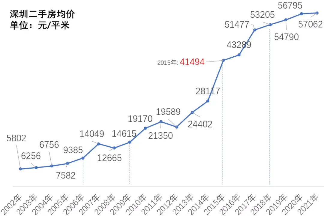 查询2002年到2020年深圳二手房房价,能画出以下曲线图: