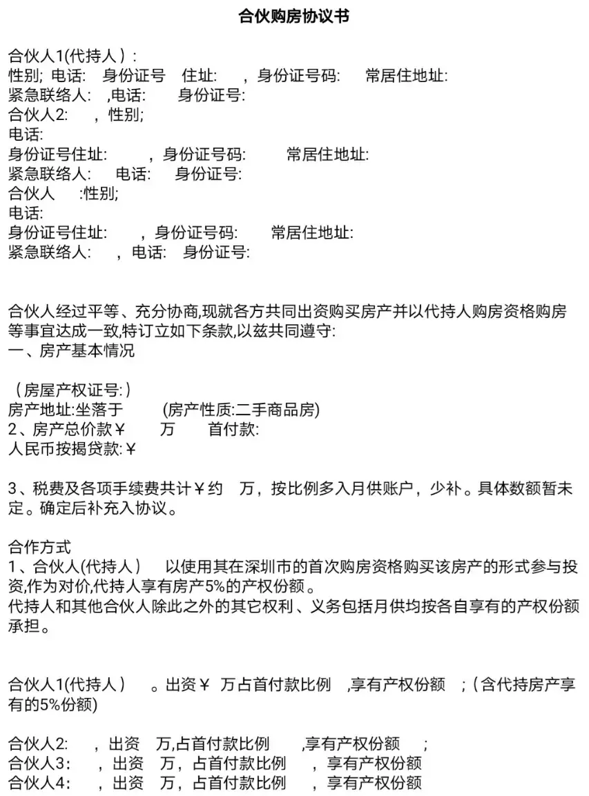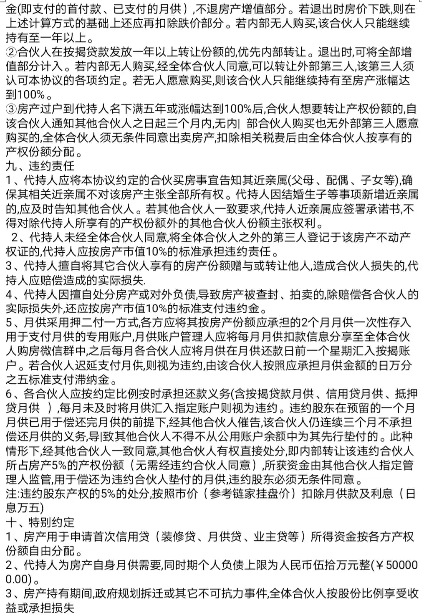 在一个项目里代持人只有1个,合伙人有多个,比如一套600万的房子,首付款30%*600=180万,可以把房产的产权分割成10份,每个合伙人出18万占一份,代持人可以自己出钱,也可以仅靠购房资格就占得5%的产权,以下是项目凑成后签的合伙购房协议书: