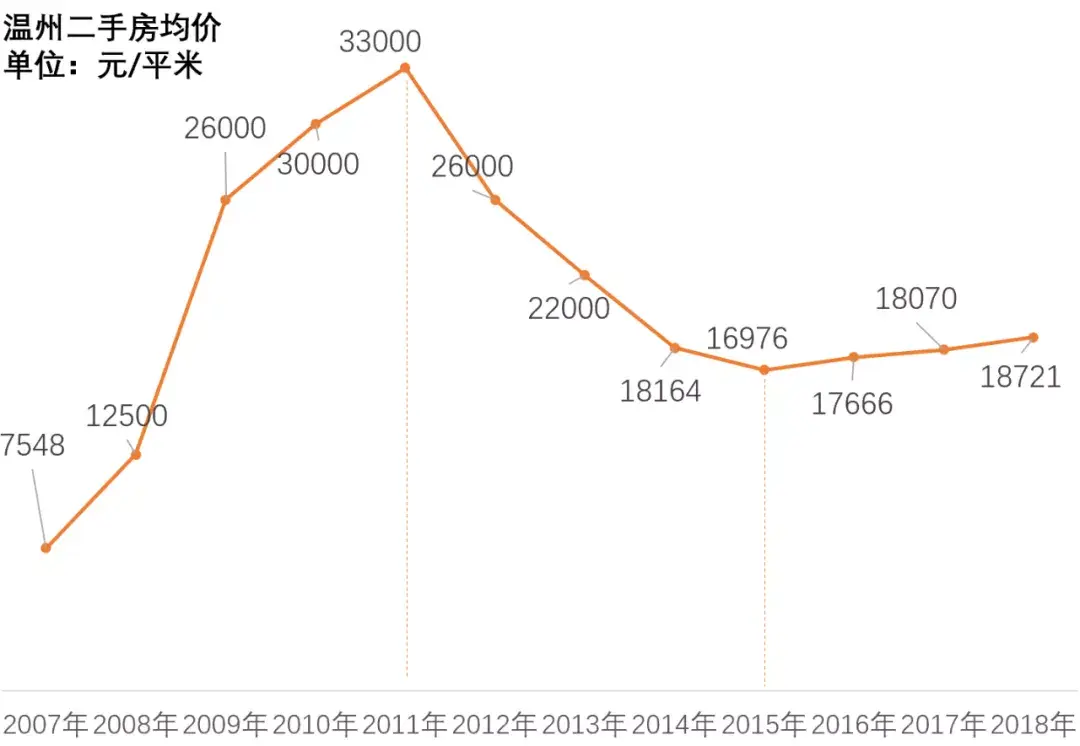 断裂的资金链如同多米诺骨牌一下席卷整个温州,最直观的反应就是温州的房价,由于太多人抛房还贷,房价从2011年到2015年直接腰斩。