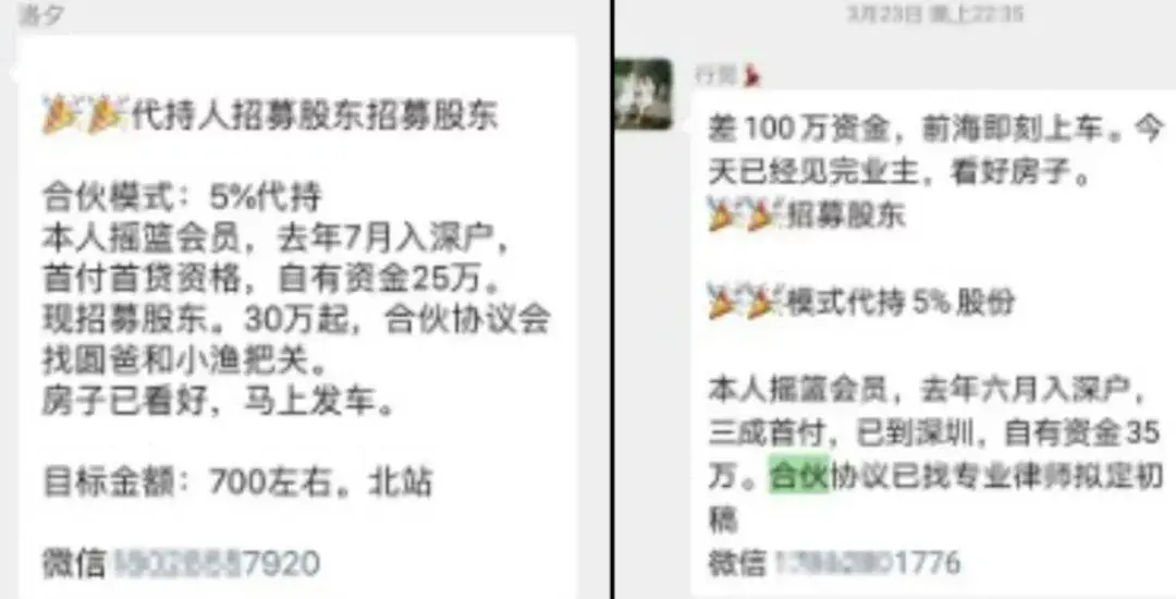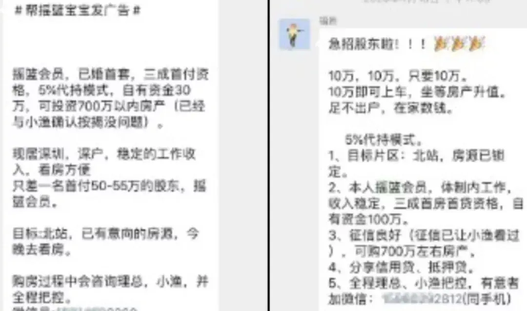 发广告的人称为代持人,合伙人与代持人的关系简单说就是一些人有钱但没深圳购房资格,一些人没钱但有深圳购房资格,于是有购房资格的申请成为深房理摇篮会员,获得组织背书,然后在群里招募有钱的合伙人。