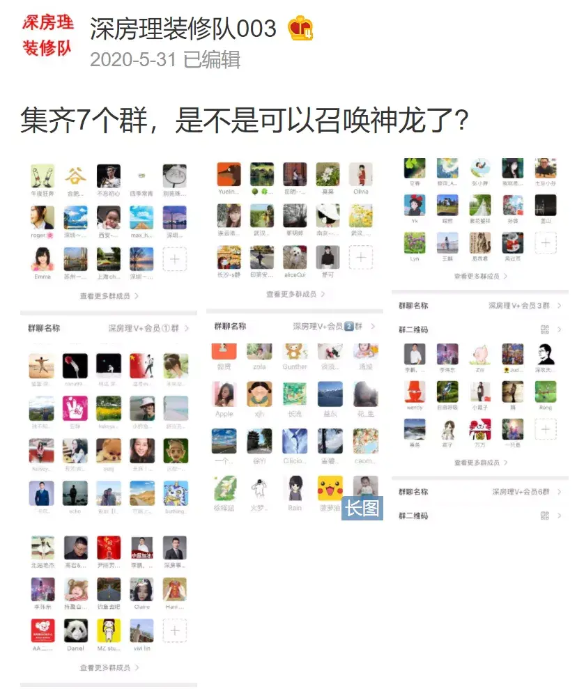明面上,深房理的收入是知识付费,其小程序 “房理” 上挂的 “摇篮会员” 入会费是13800元,根据微博 “深房理装修队003” 的曝光,其在2020年5月底就建了7个微信群,每个群都接近500人。