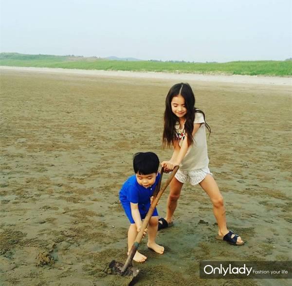 阳光、沙滩、海浪,和妈妈一起出去旅行的Cayla嘟起小嘴来比妈妈还要美呢。