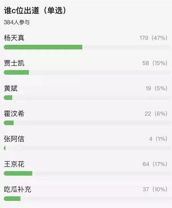 豆瓣曾经组织过一次投票,杨天真以47%的支持率力压前内地第一经纪人王京花和香港著名经纪人霍汶希,成为网友心中C位出道的王牌。