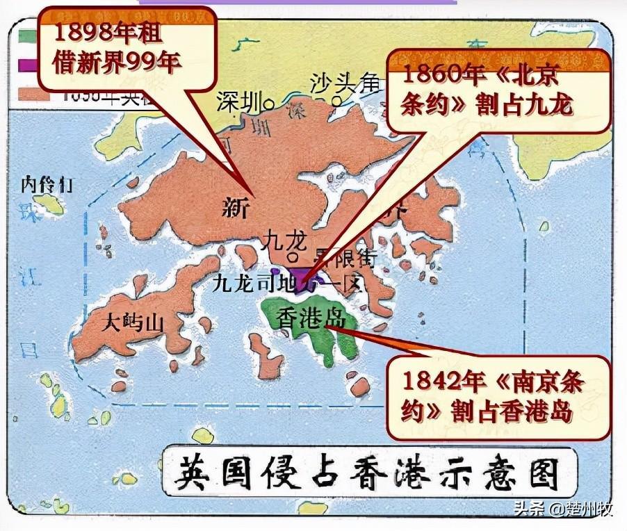 自1900年“八国联军”侵华之后,中国的腐朽和衰败也是全世界所公认的,面对软弱无能的清王朝许多国家也想来分得一杯羹,当时自诩“日不落帝国”的英国当然是充当战争的急先锋。1840年鸦片战争中国将香港岛割让给英国,1898,英国政府又与清政府在北京签订《展拓香港界址专条》中国将九龙界限线以北,至深圳河以南土地割让给英国又称“新界”。